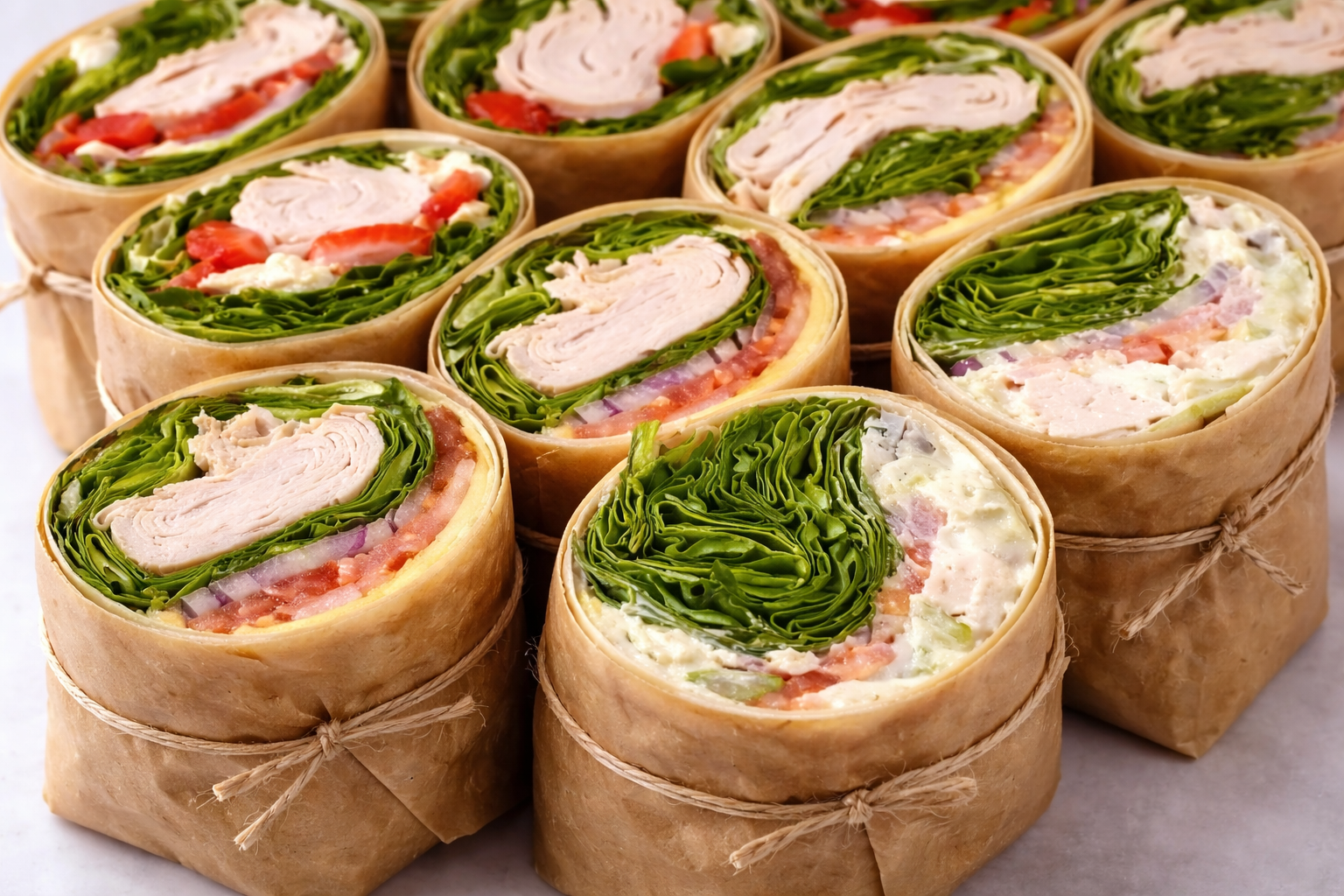 Turkey, American cheese, spinach and cranberry sauce in pita bread.