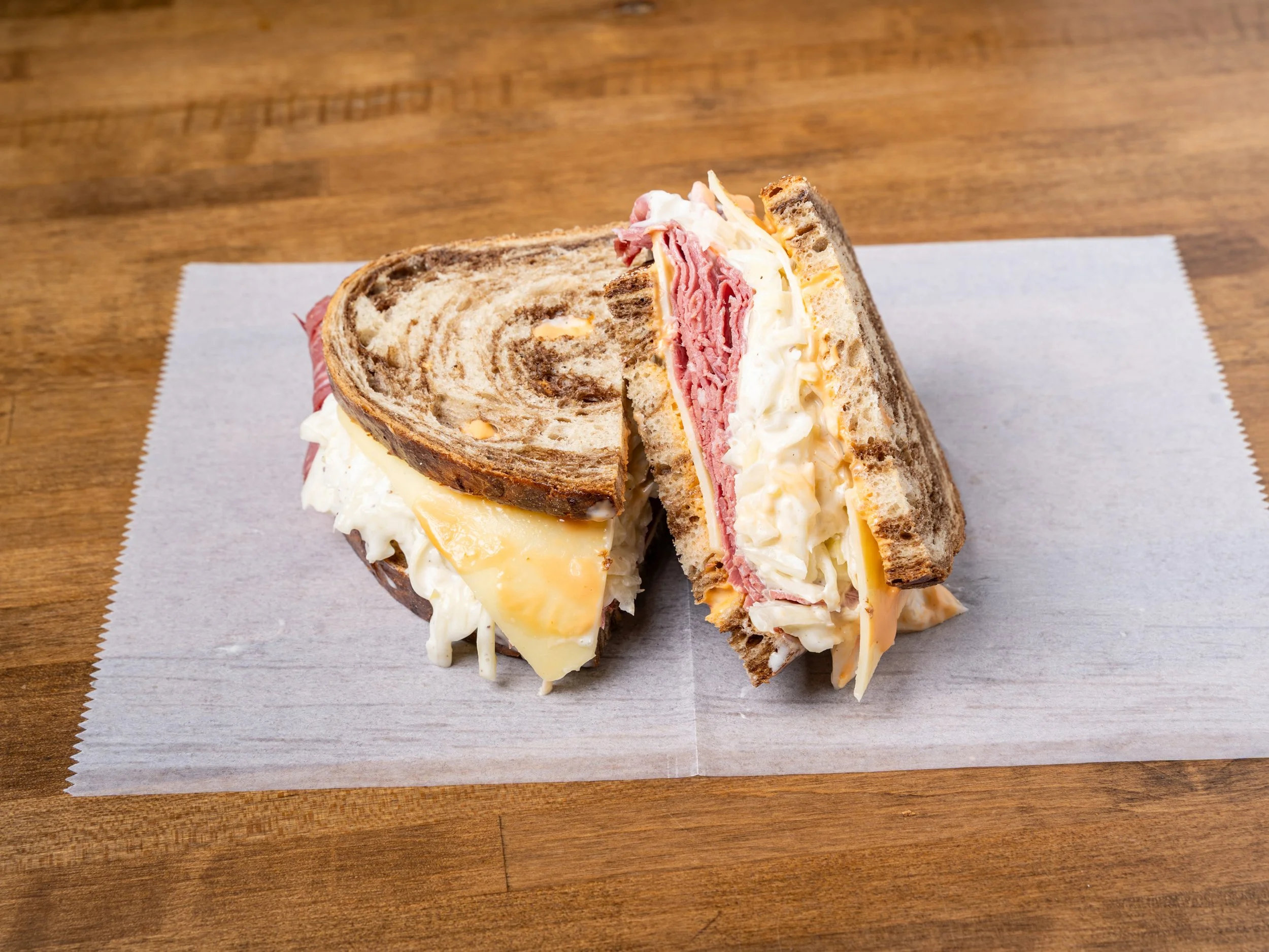 Corned beef Swiss cheese, coleslaw and Russian dressing on marble rye bread.